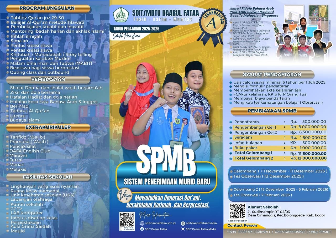 Kami mengundang putra-putri terbaik bangsa untuk bergabung bersama keluarga besar sekolah ini — tempat di mana pendidikan, karakter, dan kreativitas tumbuh seimbang. Bersama guru-guru yang berdedikasi dan lingkungan belajar yang inspiratif, kami berkomitmen mencetak generasi yang unggul, berakhlak, dan siap menghadapi tantangan masa depan.